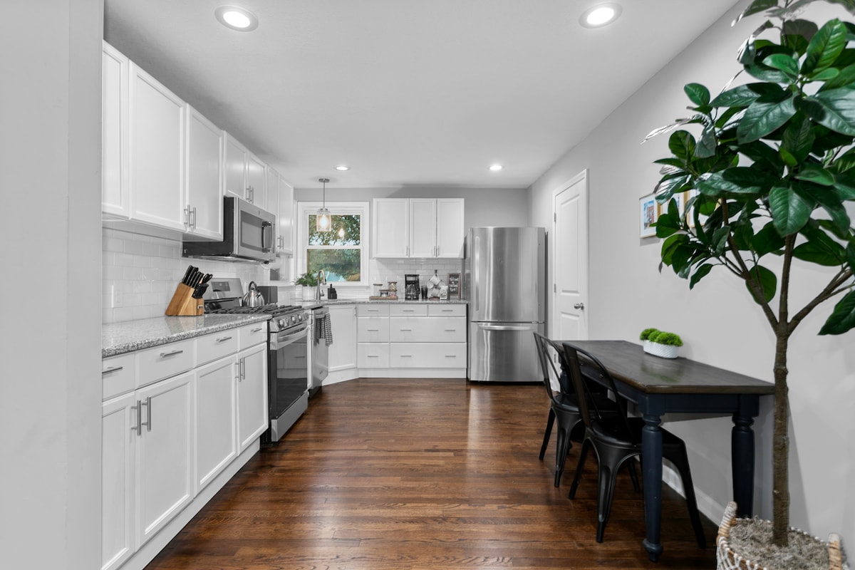 Relájate en los sofás de terciopelo azul zafiro junto a la chimenea de esta cabaña de diseño del Medio Oeste. El concepto abierto de la sala de estar fluye hacia la cocina del chef y el comedor de la granja bajo impresionantes lámparas de cobre. Dos dormitorios serenos con sábanas de primera calidad, lavandería completa, baño inspirado en un spa. Relájate en el porche cubierto con pilares de piedra o explora Strawberry Hill. Aparcamiento privado, televisores inteligentes en todas partes, a poca distancia de SplitLog Coffee. La comodidad moderna se une al encanto artesanal. Apto para mascotas. Tu escapada perfecta a Kansas City