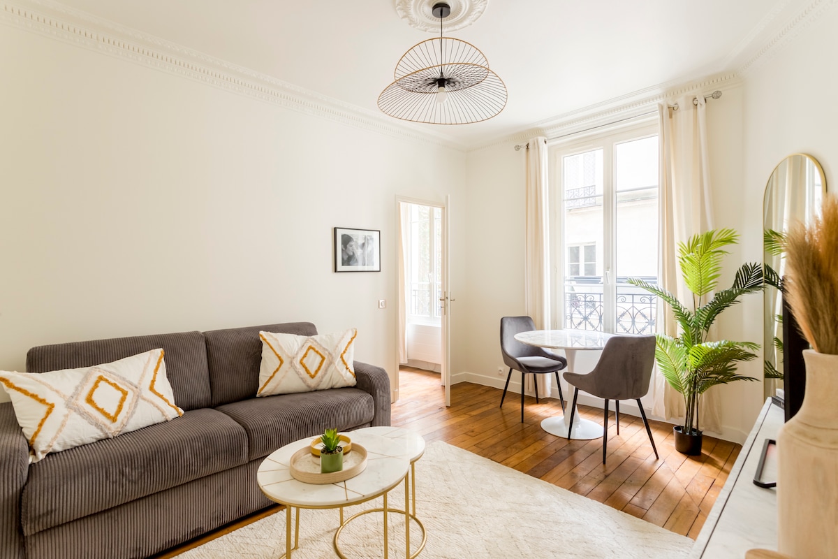 Elegante apartamento de 66 m2 en el centro de París, ¡recientemente reformado a la perfección del lujo! Este es un apartamento de 2 dormitorios, ubicado en el centro donde se encuentran los distritos 9 y 10. - Hermosos techos altos con acabados de lujo. - Estación de trabajo con escritorio de pie, wifi de fibra RÁPIDA, monitor, teclado, ratón. - Cocina totalmente equipada (incluye Nespresso, NutriBullet, horno, lavavajillas, etc.) - Televisor Samsung Frame (Netflix, Prime, YouTube, más de 200 canales). - Baño de mármol de lujo.