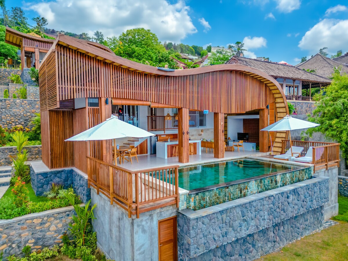 Casa de vacaciones elegante, cómoda y totalmente equipada con amplia sala de estar y tres dormitorios y baños, una piscina infinita, vistas ininterrumpidas al mar (con Lombok y los Gilis en el horizonte) y acceso directo a la playa. Es un lugar tranquilo rodeado de hermosos jardines, con montañas en la parte trasera y mar / playa en la parte delantera. Varios restaurantes con cocina local e internacional, así como un spa, están a solo unos pasos de la propiedad.