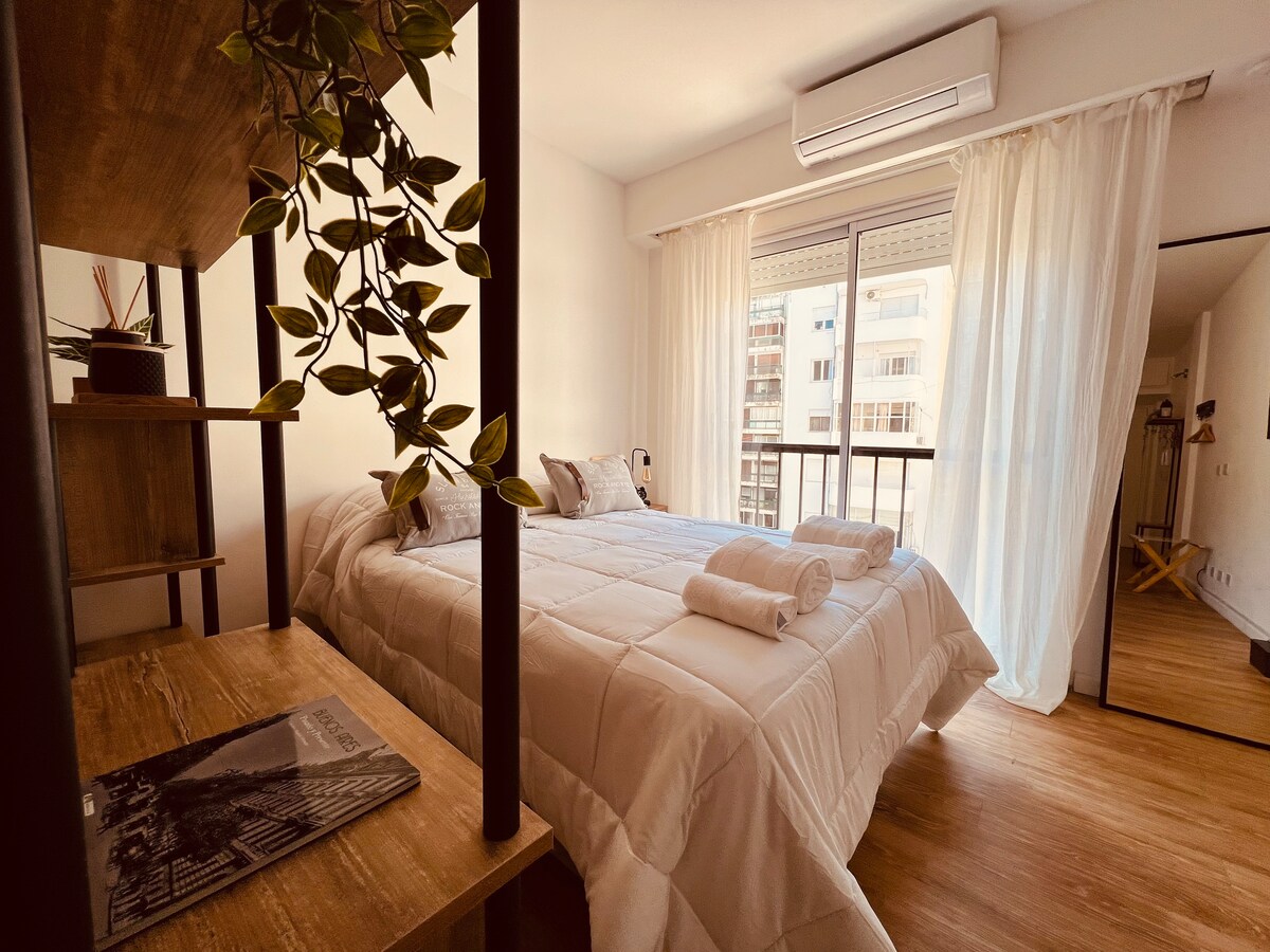 Estamos de estreno!. Quedó hermoso, te vas a enamorar de este studio apartment!. Armado y decorado con mucho amor y buen gusto, con detalles elegantes y sutilezas especialmente diseñadas para el confort y el disfrute del huesped. Balcón con vista panorámica donde se puede ver la puesta de Sol☀️. Televisión HD enorme de 55 pulgadas. Excelente ubicación con todos los medios de transporte público en frente al edificio y a 4 cuadras del Shopping del Abasto.