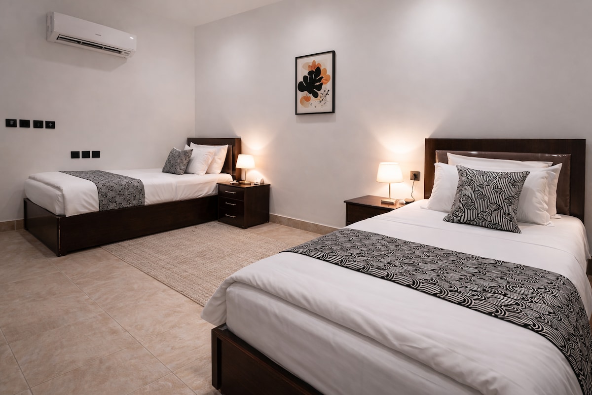 شقة واسعة بمساحة 105 م² تضم صالة مريحة، غرفة نوم ماستر وغرفة بسريرين مزدوجين، دورتين مياه (عربية وأوروبية)، مطبخ مجهز تجهيزًا أساسيًا، إنترنت سريع، تلفزيون، تكييف، غسالة ملابس، بالإضافة إلى مصعد ومواقف سيارات. Spacious 105 sqm apartment featuring a comfortable living area, master bedroom and a bedroom with two double beds, two bathrooms (Arabic & European style), basically equipped kitchen, high-speed internet, TV, air conditioning, washing machine, elevator, and parking.
