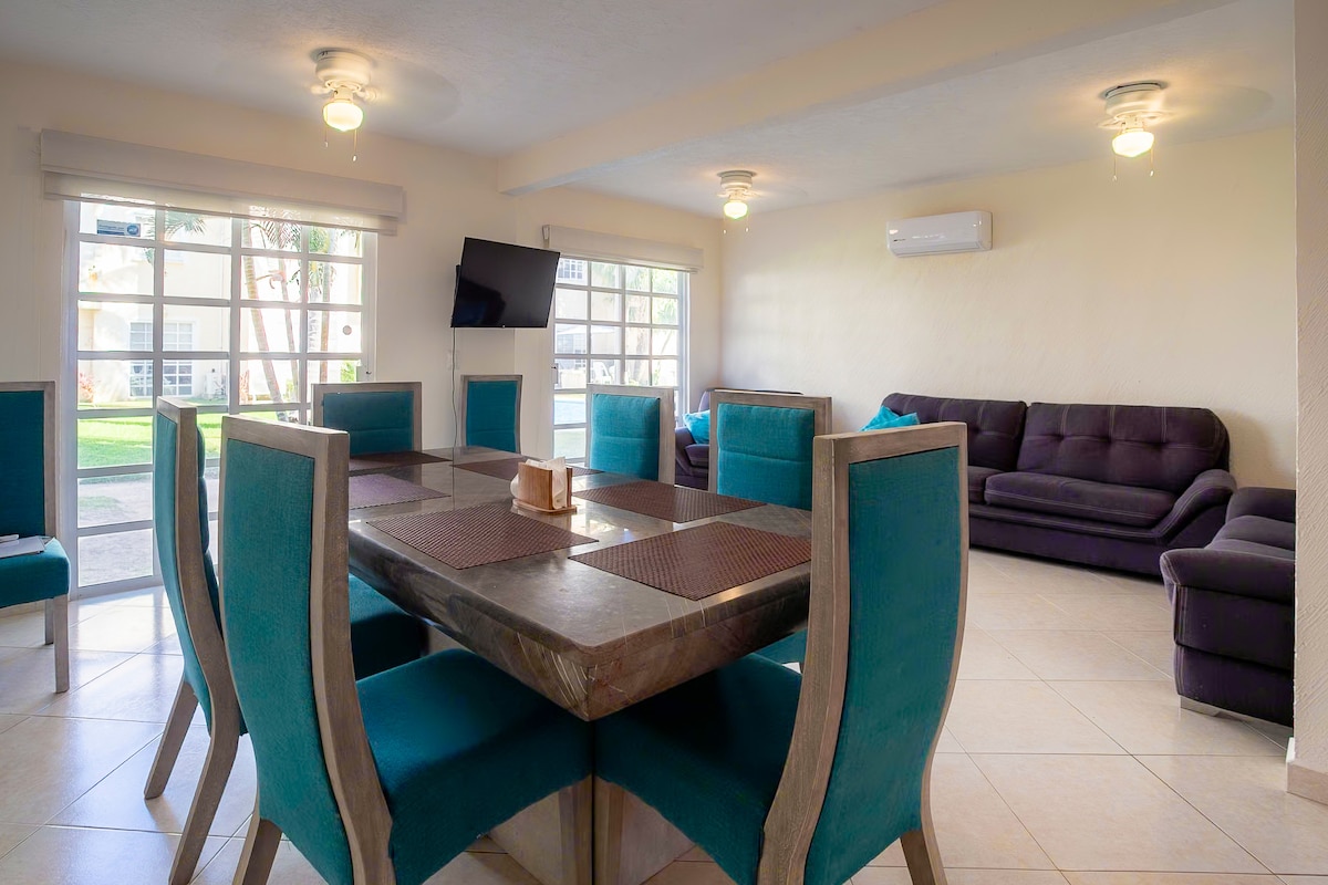 Relájate con toda la familia en este alojamiento donde la tranquilidad se respira. Excelente ubicación si buscas alejarte un poco de la civilización sin permanecer desconectado. A unos 5 kms de barra vieja y 10 mins del Forum Disfruta las playas y la gastronomía de barra vieja, playa la gloria, playa Bonfil y cerca de plaza la isla. Cuenta con club de playa a 3 kms y alberca compartida en el residencial. Puedes llevar tus bicicletas y disfrutar de la ciclovía qué hay en zona diamante