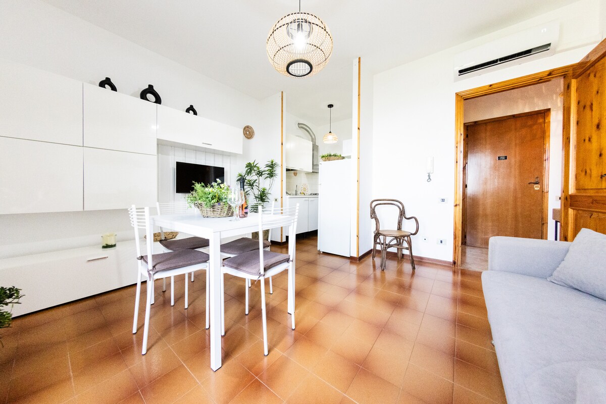 Apartamento en planta baja con gran jardín y piscina de USO EXCLUSIVO. La piscina está equipada con tumbonas y sombrillas. La sala de estar con cocina equipada, que incluye nevera, horno, microondas, lavavajillas y lavadora; un dormitorio doble con la posibilidad de una tercera cama individual y un baño privado baño; Segundo dormitorio doble con baño privado y vestidor. Capacidad para 5 personas. Hay una cuna disponible para un niño adicional. Estacionamiento en el alojamiento.