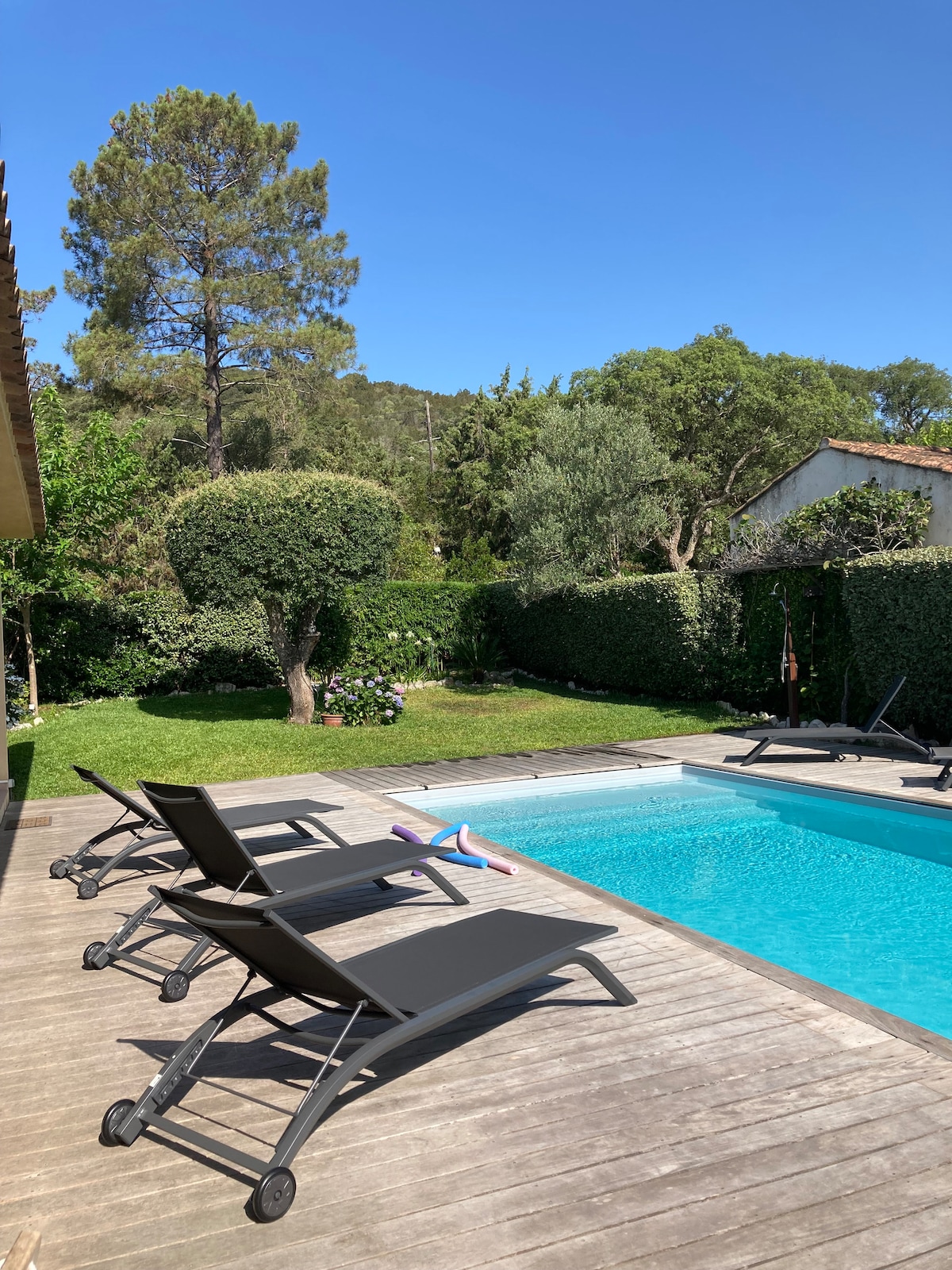 Notre logement offre une magnifique vue sur la montagne. Vous partagerez avec nous une piscine de 6X3M. La plage est accessible à pieds. Totalement rénové par nos soins, avec une décoration unique et raffinée. Vous disposez de 2 lits individuels dans la chambre et d’un divan lit 140X190 dans le séjour. La terrasse est équipée de fauteuils, table, chaises, barbecue. Isolés dans un immense jardin vous y serez au calme absolu. Vos enfants et animaux pourront y circuler en toute sécurité