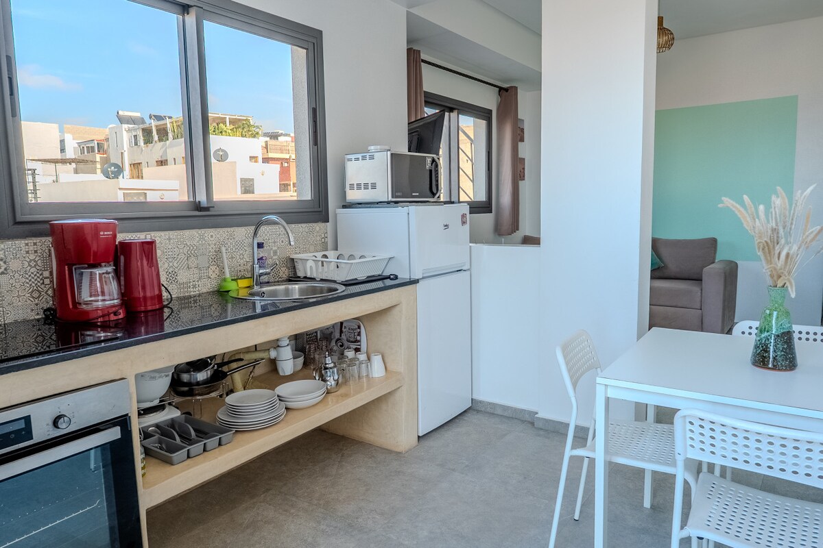 🌴 La Petite Palmeraie – Wellness Residence, Tamraght Bienvenue dans notre résidence de bien-être, où détente et confort sont au cœur de l’expérience. Les résidents bénéficient d’un accès privilégié au spa et hammam Mianïa, réservé aux femmes, sur réservation, avec 10% de réduction. Duplex 1 chambre : * Balcon et rooftop privatif avec jacuzzi et zone lounge * Cuisine et salon équipés * TV incluse