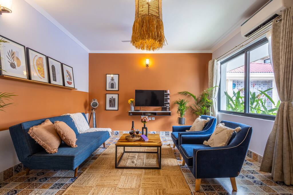 Experimenta Gem'Ray, por @ray_cation: un apartamento moderno envuelto en huertos de mango, donde los susurros de la naturaleza se mezclan con el pulso vibrante de Goa 🌞 1BHK Oasis: despierta con el canto de los pájaros y los pavos reales (si tienes suerte), luego explora las animadas cafeterías, clubes y playas bañadas por el sol. 🏖️ 📚Relájate con un libro, conquista el trabajo remoto 💻 con wifi robusto y respaldo de energía⚡ 🚗Perfectamente preparado para acceder a los lugares más populares de Goa: Anjuna, Assagao, Baga, Vagator, Morjim 🅿️Además, disfruta de un amplio espacio de estacionamiento, ¡un lujo poco común en Goa!