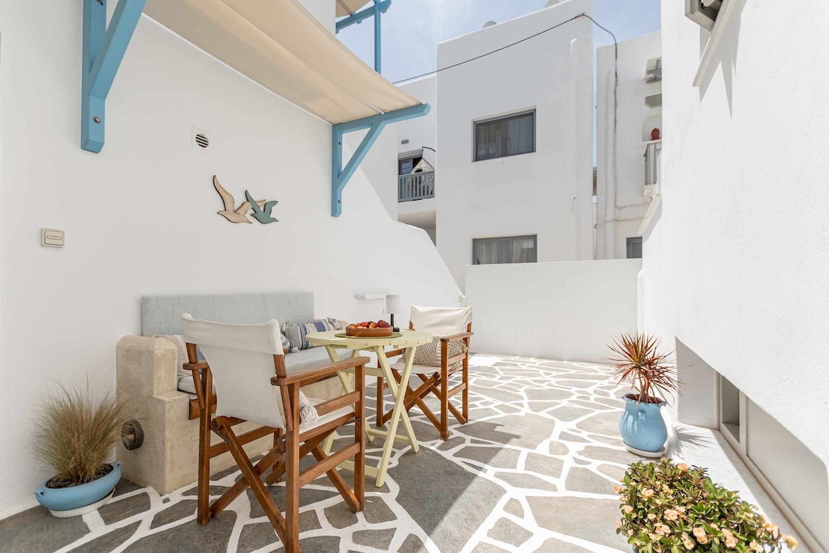 Abre las contraventanas azul marino y deja entrar la brisa refrescante, luego prepara un refrigerio en la encimera de hormigón de la cocina urbana en un refugio frente al mar. ¡Entra en la espaciosa y frondosa terraza para disfrutar de unas tranquilas bebidas al atardecer con vistas panorámicas al mar! El apartamento está situado junto a una playa de arena para nadar por la mañana y a 2 minutos a pie del centro de Naousa y su plaza principal. A pocos pasos hay tiendas, restaurantes, bares y clubes, ¡pero la zona es muy tranquila y silenciosa!