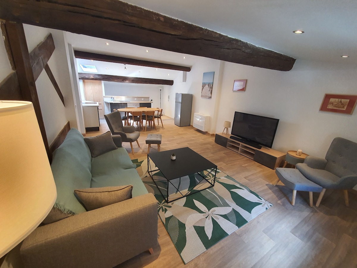 Idealmente situado en el corazón de la ciudad, bonito apartamento con una decoración cuidada para hasta 4 personas. Tranquilo, acogedor, totalmente equipado, wifi y aire acondicionado. Hermosa terraza con vistas al jardín y barbacoa de gas. Cerca de las tiendas, a un minuto a pie de las murallas y el mercado, y a 10 minutos en coche del mar. Se puede aparcar gratis a 200 metros del apartamento en un parking vigilado por cámaras. A 3 minutos a pie de la oficina de turismo y a 10 minutos de la estación de tren SNCF.