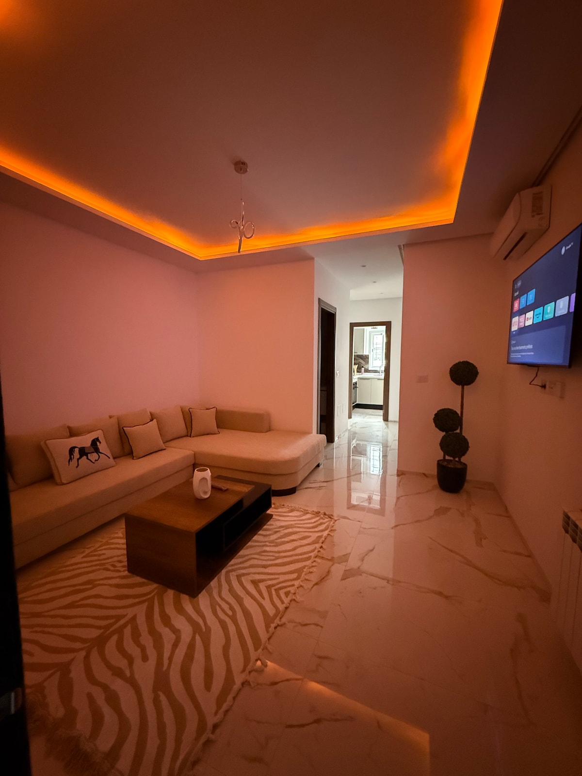 Elegante S+1 situado en Ain Zaghouan, ideal para una estancia acogedora en Túnez. Disfruta de un salón luminoso con TV conectada, un dormitorio cómodo, una cocina moderna totalmente equipada, un baño de alta gama y un balcón privado. Residencia segura con ascensor, wifi, aire acondicionado... Ubicación céntrica y cerca de todas las comodidades. ¡Disfrute de la elegancia en un entorno tranquilo y refinado!