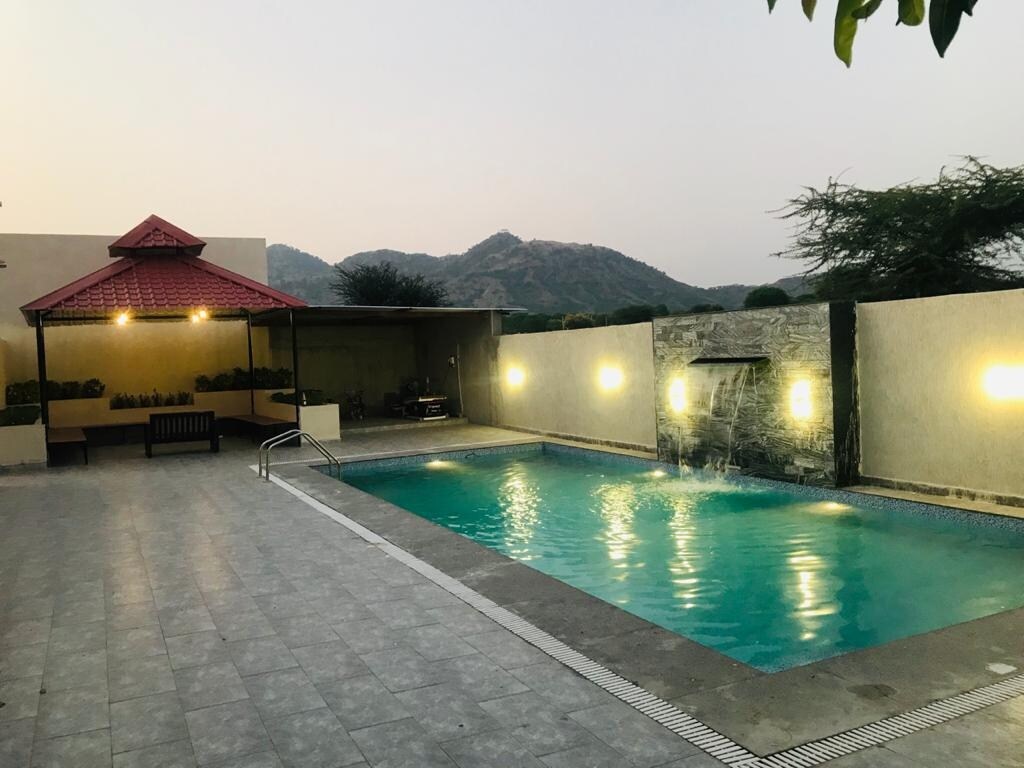 Escape to our peaceful countryside farmstay, surrounded by lush fields and fresh air, perfect for a relaxing getaway. Enjoy a refreshing plunge pool, cozy rustic interiors, comfortable bedding, clean washrooms, and all essential amenities including Wi-Fi, air-conditioning, a kitchenette, and secure parking. The outdoor seating area offers beautiful sunrise and sunset views, while open spaces make it ideal for families, couples, and nature lovers. Perfect place for parties.