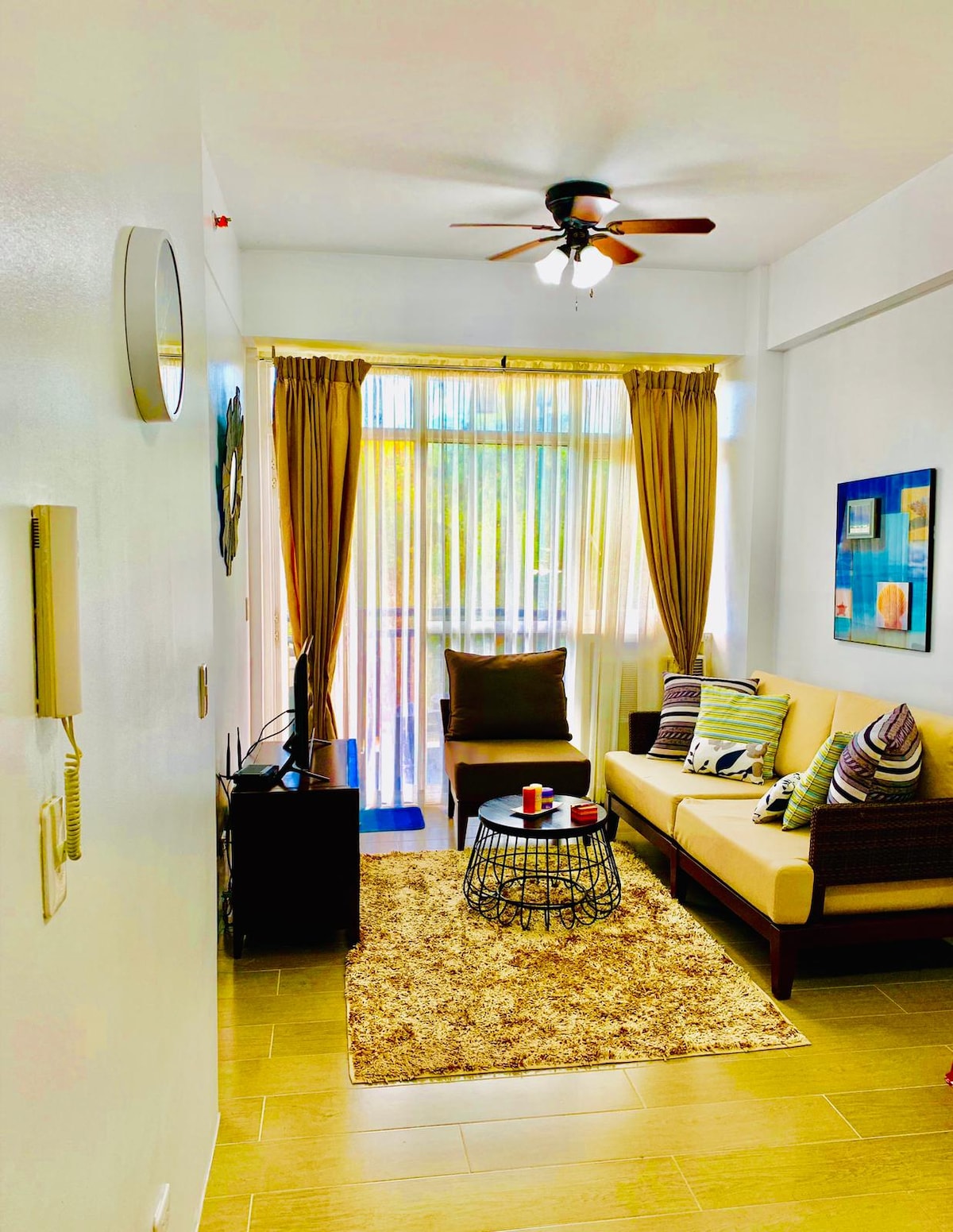 De inspiración marroquí. Espacio moderno, elegante, cómodo, funcional y digno de fotografiar. Ideal para amigos, familiares o personas que deseen trabajar de forma remota mientras disfrutan de un largo tiempo de vacaciones. Completo con cocina, utensilios de cocina, nevera, horno microondas, lavadora, TV inteligente, comedor de 4 plazas, balcón con vistas al amanecer y a la playa, etc. Con servicios de seguridad y recepción 24 horas, 7 días a la semana. Unidad de apartamento de 1 dormitorio ubicada en Boracay Newcoast, un exclusivo complejo de 150 hectáreas cerca de la icónica zona de Keyhole.