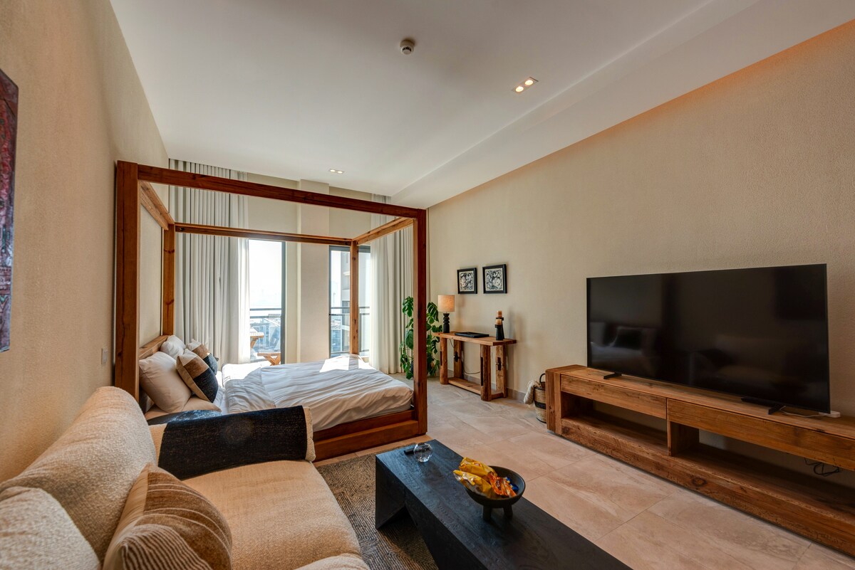 Estudio de lujo | Vista al horizonte y acogedora cama tamaño king.