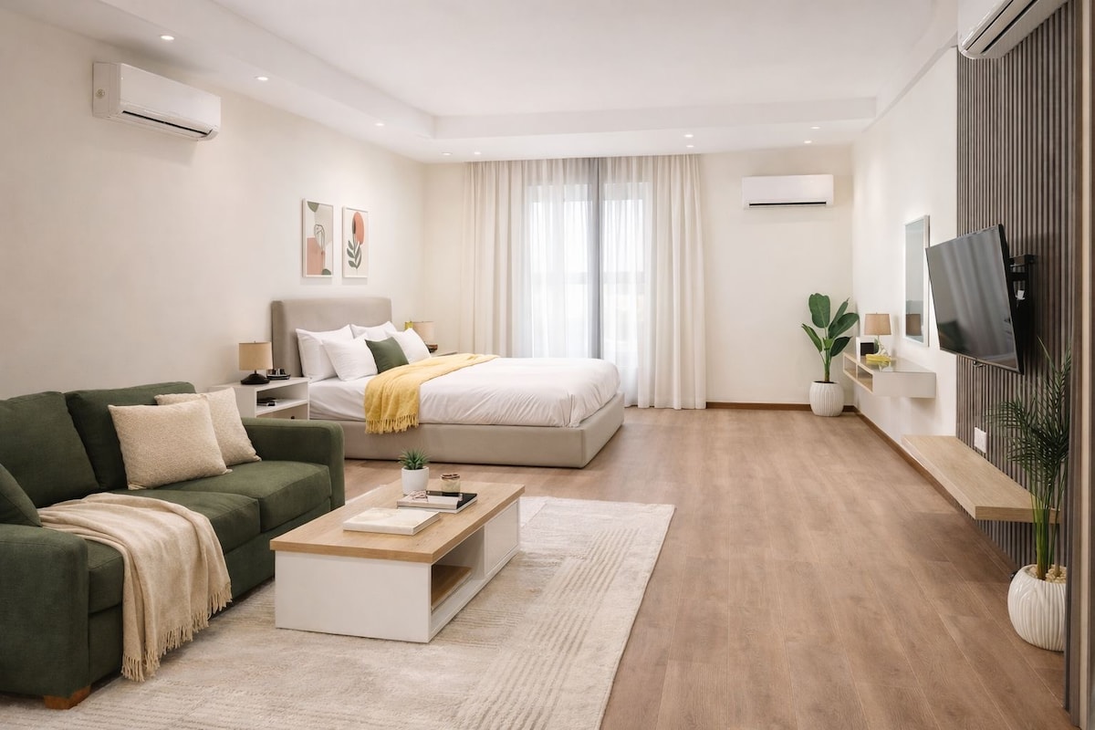 🏖️ Acerca de este espacio Despiértate con el azul infinito del Mediterráneo en este elegante apartamento costero de 2 dormitorios en el corazón de Alejandría. Aunque está situado en la segunda fila, disfruta de una vista panorámica del mar completamente despejada: ningún edificio bloquea el impresionante horizonte. Con una terraza soleada, interiores luminosos y una amplia sala de estar de planta abierta, es tu refugio privado junto al mar, perfecto para familias, amigos o grupos pequeños que buscan comodidad, estilo y una relación calidad-precio inmejorable.
