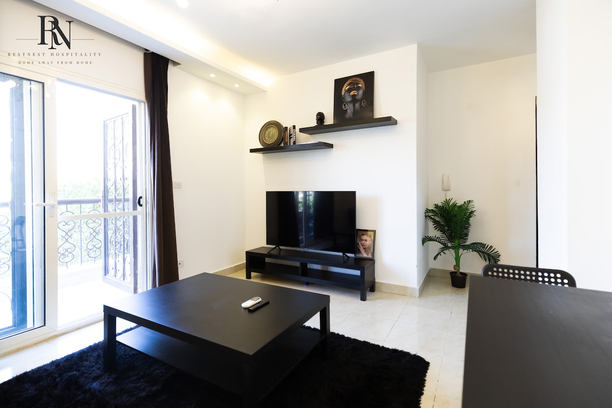 Te damos la bienvenida a nuestro elegante departamento de 1 dormitorio: Envíanos un mensaje para obtener descuentos especiales y de temporada. ●Dormitorio (tamaño queen + sofá cama) ●Sala de estar (TV inteligente + sofá) ●Comedor para 3 personas Baño ●elegante ●Cocina pequeña totalmente equipada Situado en el corazón de la ciudad, estarás a pocos minutos de cafeterías de moda, la vibrante vida nocturna y los mejores lugares para comer. ●WaterWay 5A, ●Distrito 5 de Marakez ●Uavenues ●La unidad ●Katameya ●Jardín 8 ●El Malahy. ●CFC ●Arabella y muchos otros lugares. Ponte en contacto con nosotros para obtener más recomendaciones.