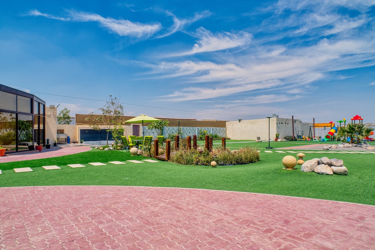 Disfruta de una estancia tranquila en una hermosa casa en una granja privada rodeada de árboles y espacios verdes con una piscina privada. El lugar es ideal para familias y aquellos que buscan relajarse lejos del ajetreo y el bullicio de la ciudad. La casa está totalmente equipada (3 cómodas habitaciones, cocina, asientos al aire libre, parrilla). Cerca de los servicios y las carreteras principales, está a poca distancia en auto de Dubai y ofrece una gran vista de la naturaleza. Una auténtica experiencia rural con lujo y confort en medio del desierto