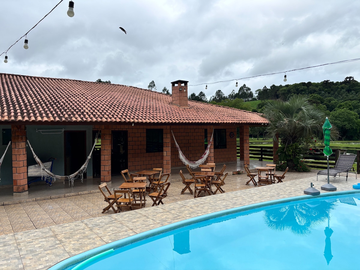 Una invitación para relajarte Lagos para pescar, mucho espacio al aire libre, cómoda casa con balcones y 5 dormitorios (1 suite), 3 baños completos, cocina equipada: estufa de leña, congelador, refrigerador, freidora de aire, microondas, horno eléctrico y pequeños electrodomésticos, TV de 55'e Internet rural de alta velocidad (Starlink). Tiene una gran piscina y un arroyo de piedra, Paredão de Araucárias. ¡Perfecto para relajarse y conectarse con un poco de vida rural!