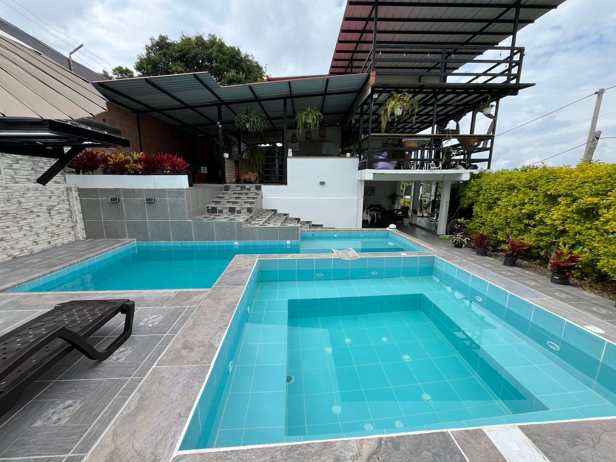 Casa de campo privada PREMIUM. Tomate un cafe y relajate en la naturaleza Cerca de Panaca, parque del cafe y Pereira. Un refugio de lujo en el corazón del eje cafetero JACUZZI, Piscina, tv wifi, agua caliente, ASADOR, ZONA DE FOGATA zonas verdes con hamaca. 5 Baños, cocina. lavadora, seguro hotelero. Este lugar único tiene su propio estilo y bienestar. 10 camas dobles 4 habitaciones 15 huespedes Crea recuerdos inolvidables en este alojamiento único y familiar.
