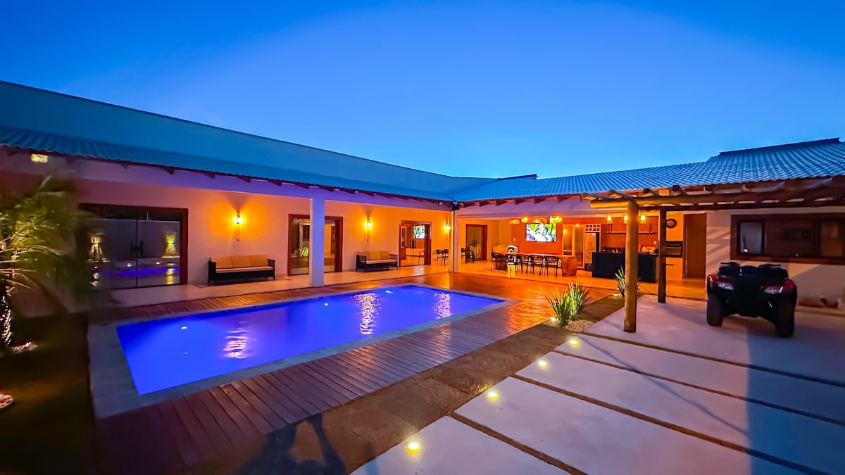 La casa en un barrio nuevo cerca del centro y a 800 metros de la playa y proceder a supermercado etc. En la zona de ocio tenemos piscina iluminada pergolato, gourmet con mesa, congelador, barbacoa eléctrica, estufa y baño. Un gran jardín donde puedes llevar a tu mascota y estacionar. Dentro de la casa encontrarás una cocina súper equipada con lavavajillas y lavadora, plancha eléctrica, microondas y licuadora, etc. Cuatro habitaciones con aire acondicionado, sala de TV con wifi y 3 baños.