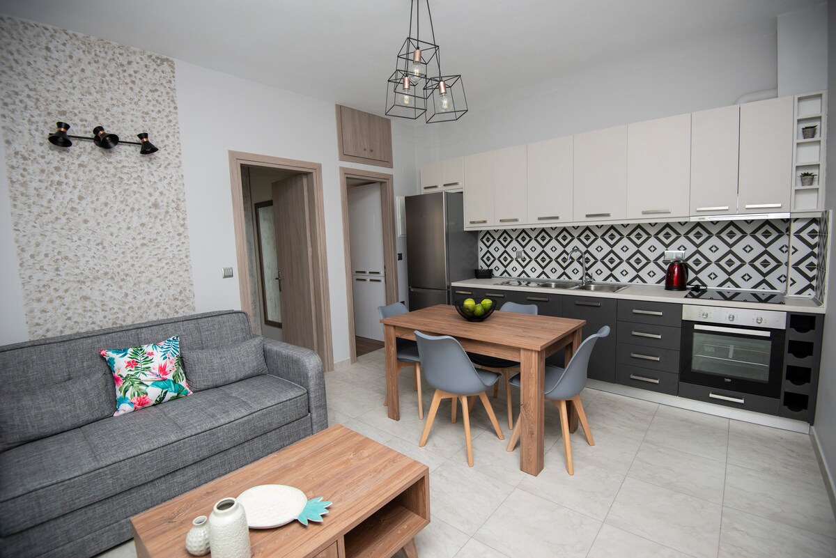 Casa de nueva construcción en octubre de 2023, nuestro departamento se encuentra en el corazón de la ciudad, cerca de la hermosa playa de Alexandroupoli y es perfecta para parejas, familias y viajeros solitarios que quieran explorar Alexandroupoli. Este apartamento ha sido decorado teniendo siempre en cuenta las necesidades de un viajero moderno. Su ubicación privilegiada es definitivamente su mejor característica, aunque sus servicios y muebles cuidadosamente seleccionados te robarán el corazón.