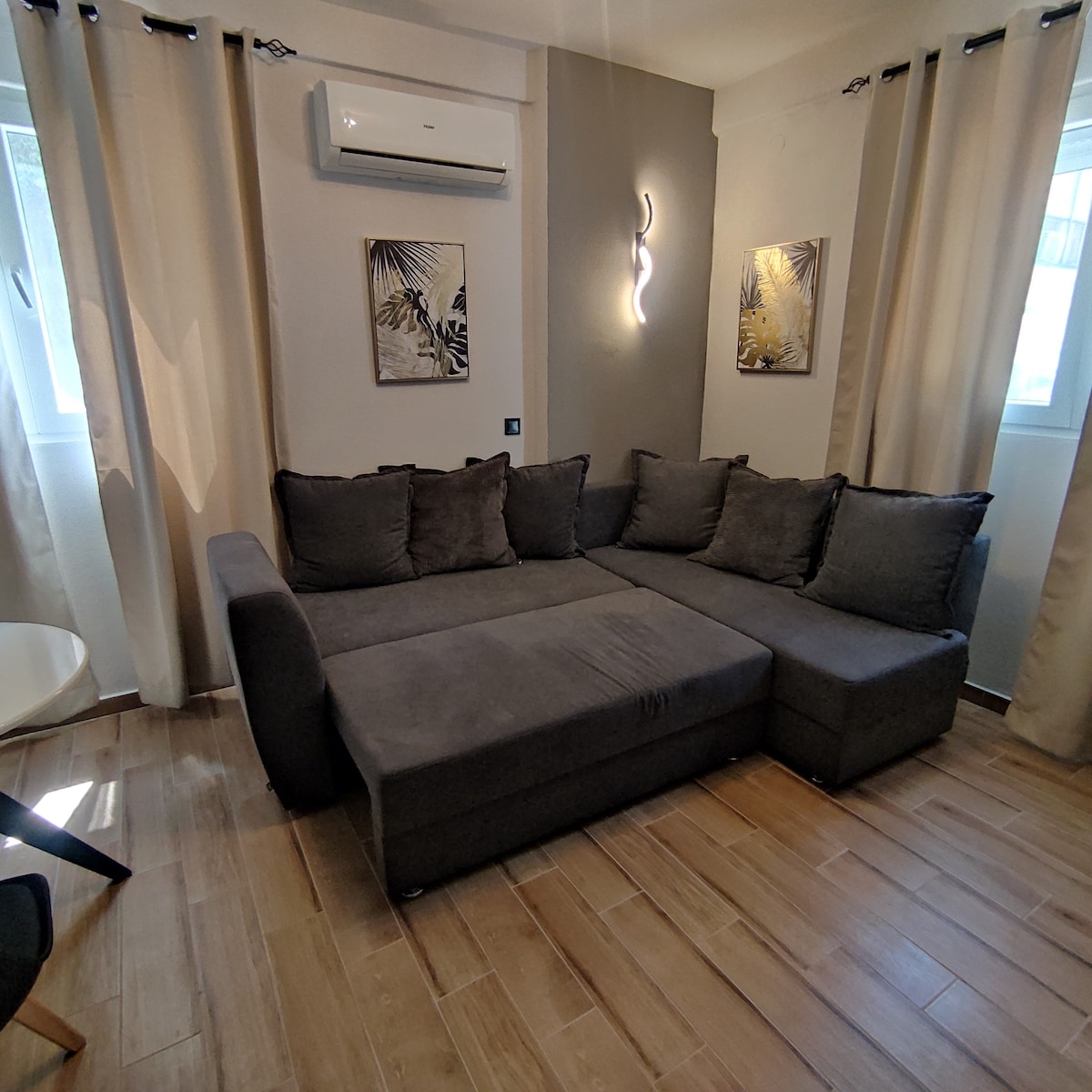 Πλήρως ανακαινισμένο διαμέρισμα με φινετσάτη αισθητική σε ένα από τα κεντρικότερα σημεία της πόλης, στον δεύτερο όροφο με πρόσβαση από τις σκάλες. Ευρύχωρο, ζεστό, μοντέρνο, ικανό να σας κλέψει την καρδιά. Αποτελείται από έναν ενιαίο χώρο που περιλαμβάνει σαλόνι-κουζίνα και queen size κρεβάτι με ανατομικό στρώμα αφρού. Ο άριστης ποιότητας καναπές γίνεται κρεβάτι και ο χώρος είναι ικανός να φιλοξενήσει με άνεση 4 άτομα. Σε περίπτωση περισσότερων ατόμων το σπίτι διαθέτει και άλλο υπνοδωμάτιο.