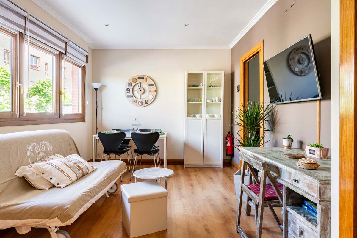 Acogedor apartamento para dos personas. Todo exterior, habitación+salón +cocina+baño completo. Sala de estar con zona de comedor, sofá cama y escritorio y SmartTV grande. Cocina independiente Zona peatonal con árboles. Parking gratuito en calle, Playas 8' de casa en coche. Todo andando metro, cafeterías, supermercado, farmacia, escuela golf, escalada... Es zona residencial de chalets sin ruidos. Estarás en un entorno verde y arboles