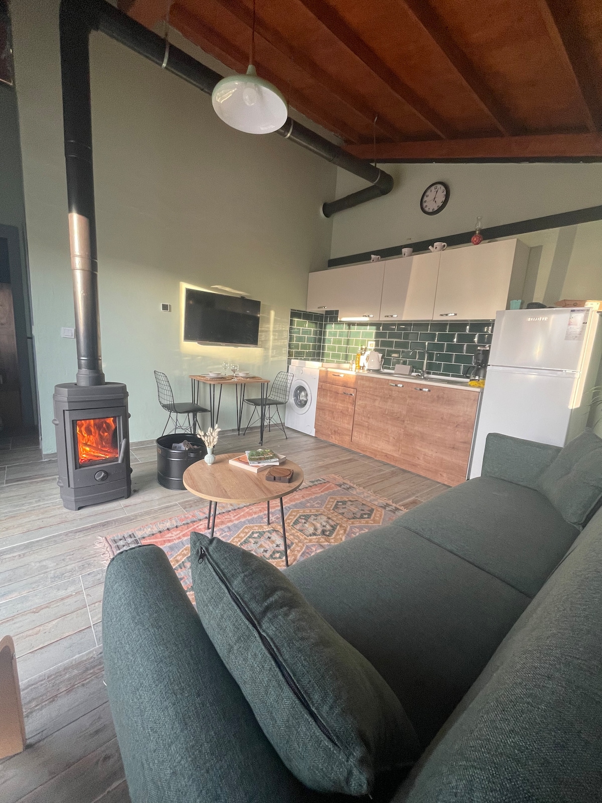 Looking for a peaceful winter escape close to İzmir? ❄️🌿 Experience true farm life in our wooden cabin: pick fresh seasonal vegetables straight from the garden and collect your morning eggs from the coop. Inside, enjoy the warmth of a wood-burning stove with a fireplace look; outside, gather around the fire pit — both fueled with olive and oak wood from Gökler Farm. Perfect for couples or families seeking a quiet, nature-filled getaway. 🔥 Welcome to Gökler Farm.