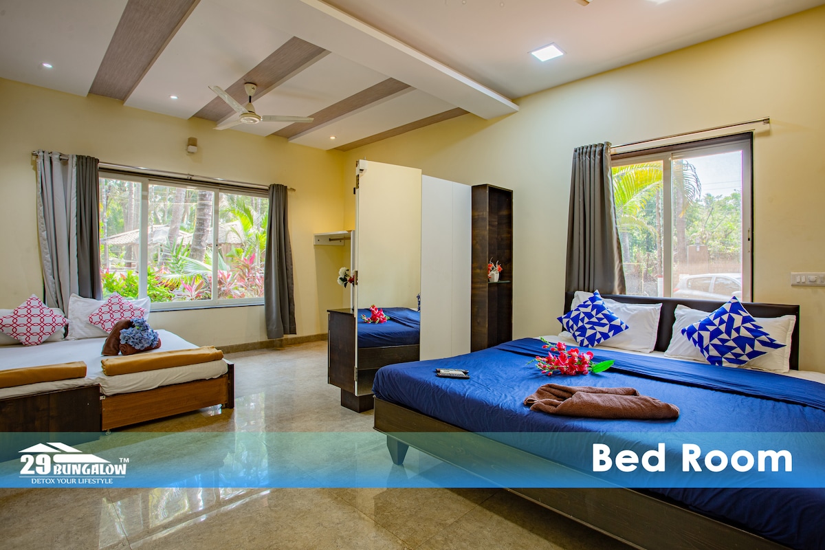 LOCATION NAGAV 2 KM FROM NAGAV BEACH WE HAVE TOTAL 5 AC ROOMS SEPARATE RECEPTION AREA WIFI ANDROID TV HOT WATER GYSER INDOOR GAMES PARKING AREA HOMEMADE FOOD KITCHEN SWIMMING POOL 12 BY 20 FEET SIZE 4.5 DEEP SWIMMING POOL BABY POOL INCLUDED SWIMMING POOL 9AM TO 9 PM SWIMMING POOL SHARING MUSIC 10 PM CLOSE TOTAL CAPACITY 10 PAX CARETAKER AVAILABLE OPEN TERRACE WITH SHADE SEATING ARRANGEMENT ADHAR CARD ID FOR CHECKIN PURPOSE PET NOT ALLOW CHECK-IN 1 PM CHECKOUT 11 AM