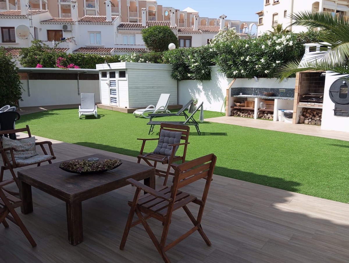 Soleado chalet con piscina privada de agua salada y gran jardín (200m2), "eco-friendly" con paneles solares, vistas al mar, a sólo 5 minutos de la playa. Cuenta con una terraza de 100m2 con pérgola para pasar el tiempo en el exterior y disfrutar del excelente clima. La casa tiene 130m2 con 2 plantas. Recientemente reformado. Con espacio para tomar el sol y juegos, gracias a su orientación al sur y relajarse en un ambiente mediterráneo. Muy cerca del centro de Santa Pola caminando.
