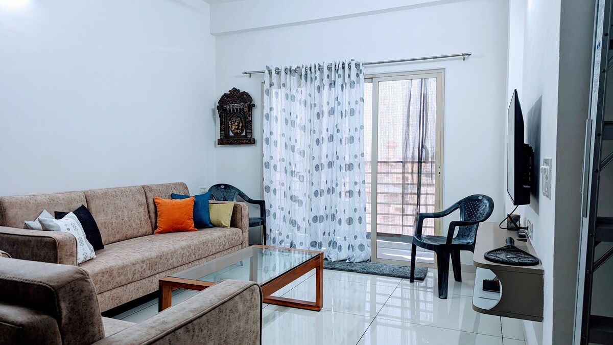 A calm, well-kept entire apartment in a secure gated society, suited for long stays and thoughtful travelers. Designed with clean, functional spaces, a dedicated work desk, private bath, practical kitchen, washing machine and private parking. Quiet surroundings with 24/7 security. Pet-friendly. A simple, refined space to settle in and feel at ease.