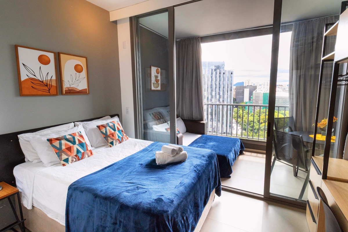 ¡Estudio completo y acogedor donde encontrarás todo para tu comodidad! El estudio ofrece: • Cama tamaño queen y un amplio sofá • Aire acondicionado y calentador • Toallas y ropa de cama • Utensilios de cocina El edificio también tiene una piscina infinita en el piso 20, gimnasio, sauna, garaje y un mini mercado. Aquí tienes todo lo que necesitas para trabajar y/o relajarte con una vista maravillosa de SP