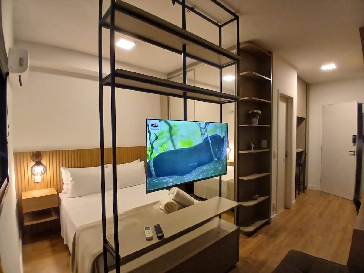 Estudio con decoración cálida en el corazón de Perdizes, en una ubicación privilegiada. Un barrio lleno de tiendas, restaurantes y supermercados. Tiene capacidad para 2 personas, tiene una cama doble de tamaño estándar, aire acondicionado, mesa de trabajo, smar tv, cocina compacta, equipada con Cooktop, microondas, air fryer, arrocera, cafetera, nevera, filtro de agua y utensilios. Conserjería las 24 horas,