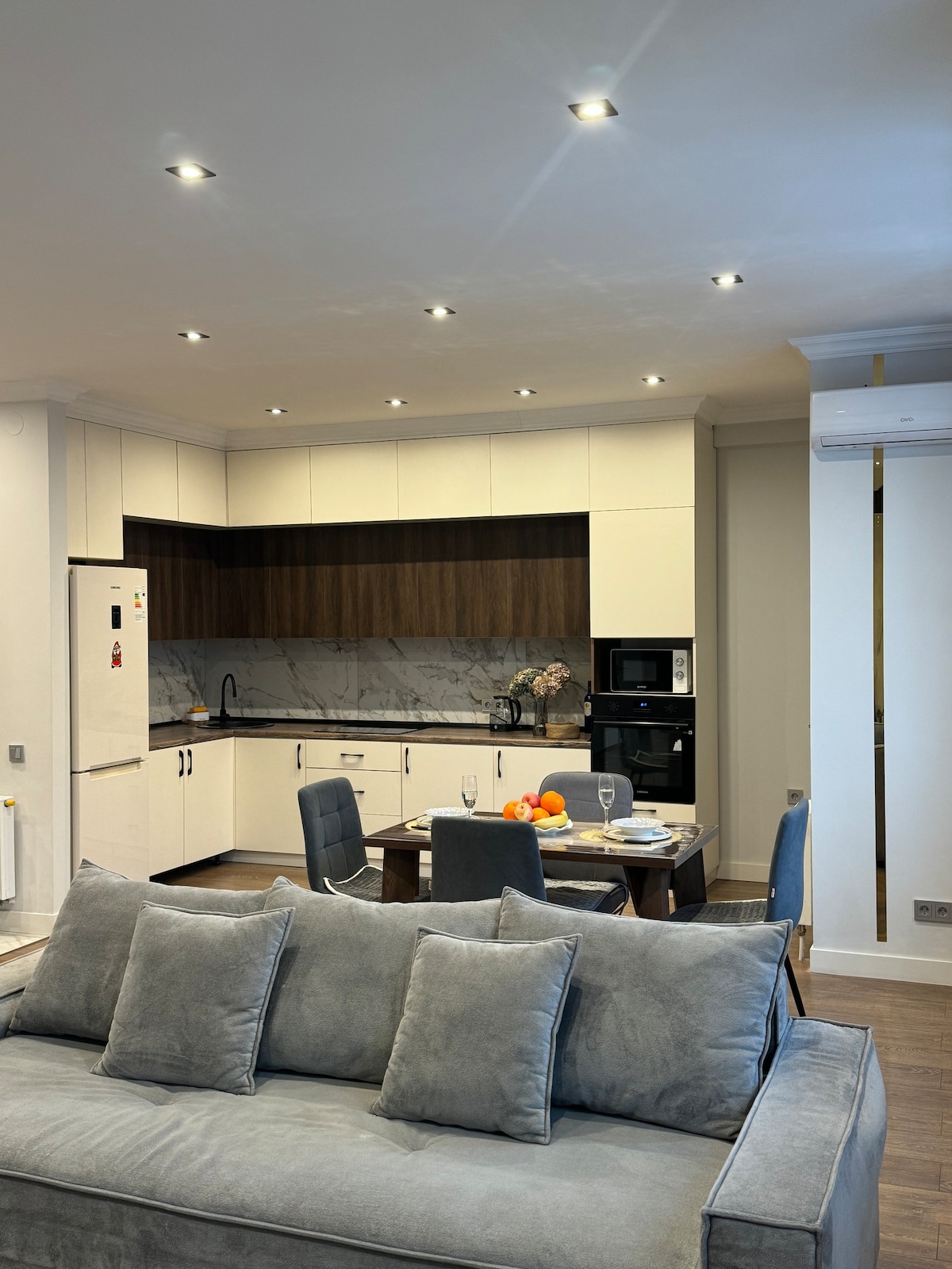 Moderno estudio de 34 m² en el mejor distrito de Almaty, junto al centro comercial MEGA. Adecuado para 3-4 huéspedes: cama con colchón ortopédico (para dos) + sofá (para un adulto o dos niños) Televisión inteligente de 55 pulgadas con Netflix, WiFi, aire acondicionado Cocina totalmente equipada, lavadora, secador de pelo, plancha, vajilla. Ropa de cama y toallas limpias. Cerradura electrónica, registro sin contacto. ¡Todo para una estancia cómoda y acogedora!