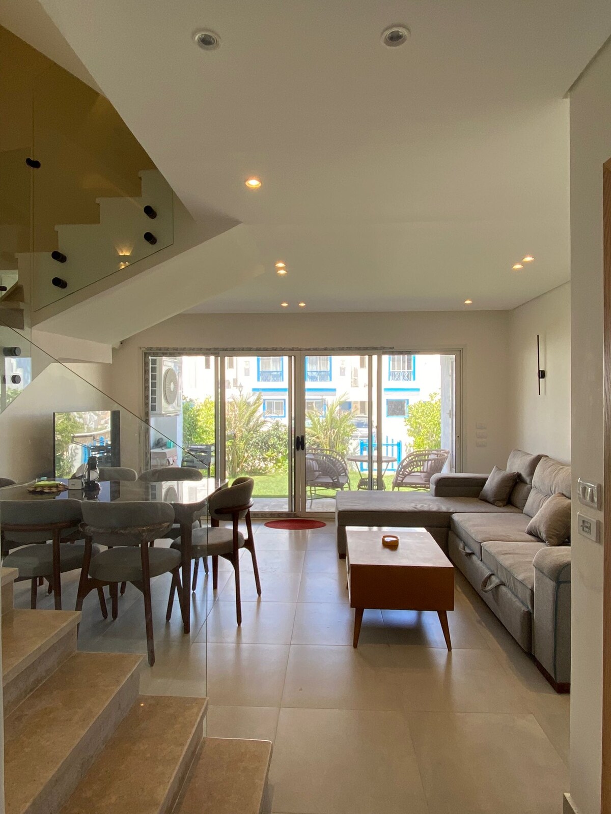 Chalet moderno de 3 dormitorios/2 baños en la planta baja en Corfú, Mountain View Ras El Hekma. Totalmente amueblado con vistas al mar, jardín privado, terraza y cocina abierta. Cuenta con un baño principal, dos dormitorios con dos camas individuales y un sofá cama en el salón. A solo unos pasos de la piscina y a 5 minutos a pie de la playa. Totalmente climatizado e ideal para familias o grupos. Zona tranquila con restaurantes y acceso al servicio de transporte. Acceso a la playa: 2000 EGP/adulto/semana pagados a MV a la llegada.