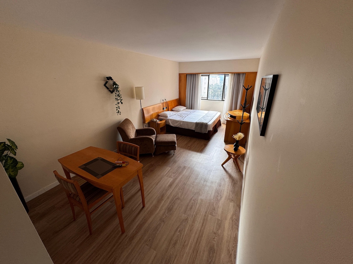 Flat próximo aos mercados Pão de Açucar, Mambo e St. Marchê. A uma quadra do Centro Comercial de Alphaville. Espaço para Home Office no Flat. Secador de Cabelo, Ar-Condicionado, TV por Assinatura, Frigobar, Tomadas USB, Poltrona, Mesa acessória, Cofre, Guarda-Roupa, Cabides Academia super equipada no condomínio, Piscina e Sauna Café da Manhã e Restaurante no condomínio (não incluso no valor da reserva)