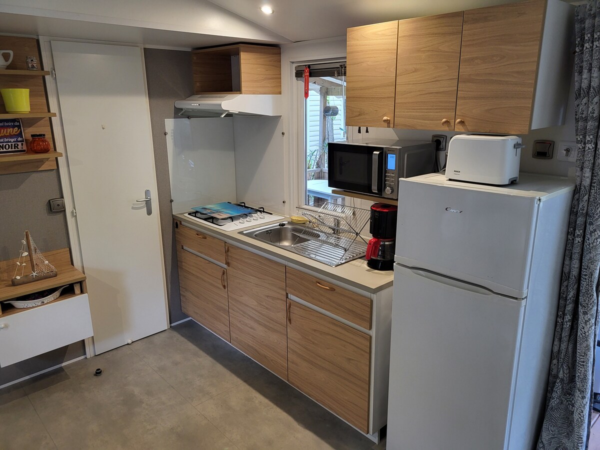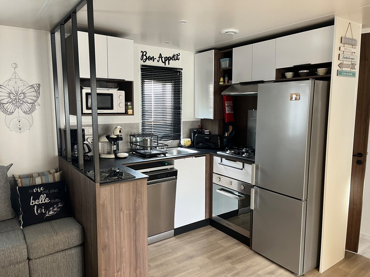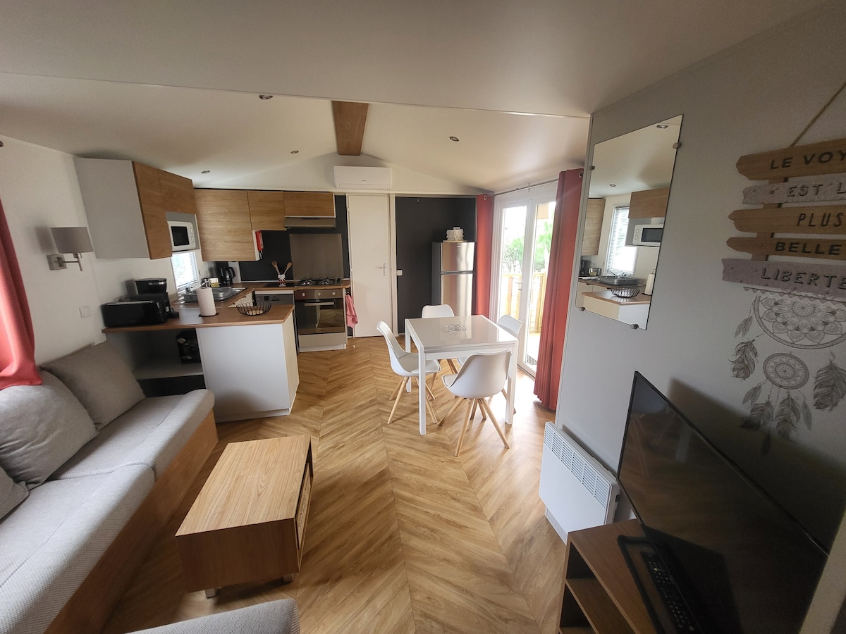 MOBIL-HOME de 6 plazas y 40 m² con aire acondicionado reversible, gran terraza exterior vallada con 1 puerta de seguridad, muebles de jardín y 2 tumbonas. Amplio salón con TV orientable, 1 sofá cama de 2 plazas, 2 habitaciones grandes, 1 de ellas principal, ropa de cama de alta gama con un gran vestidor y TV Cocina equipada, vajilla, horno, microondas, placa eléctrica, nevera con congelador, tostadora, hervidor, cafetera de filtro y cápsulas TASSIMO, lavavajillas, lavadora y tendedero.
