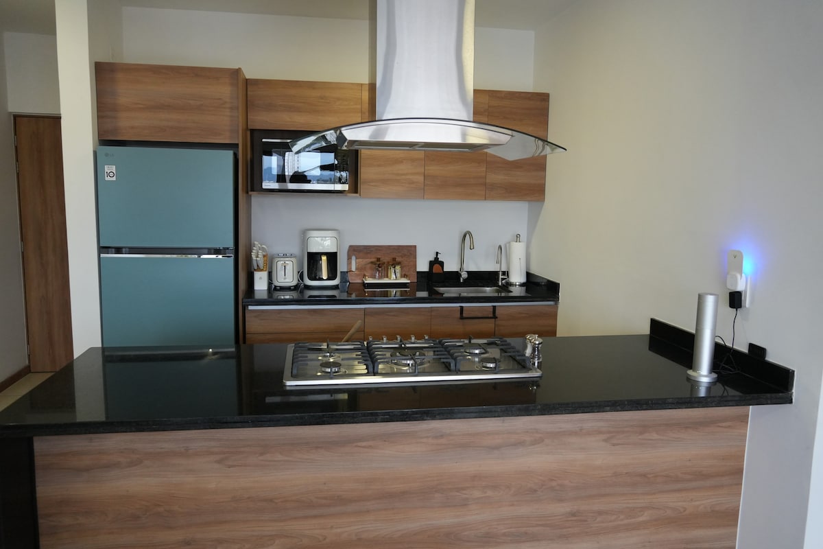 Departamento tipo Loft pequeño con todo lo necesario para una estancia placentera -Cocina Privada con Parrilla, Refri, Micro, Utensilios; ahorra y haz tu super -Baño Privado pequeño y espacioso -Escritorio Amplio y Wifi Veloz, trabaja desde aquí -Cama Matrimonial, descansa y ve la Smart Tv en un colchón confortable -Espacio Suficiente, guarda ropa doblada o colgada -Ventanas Amplias, gran iluminación y ventilación Gran Ubicación para Turismo, Viaje de Trabajo, Estudiantes o Salida en pareja