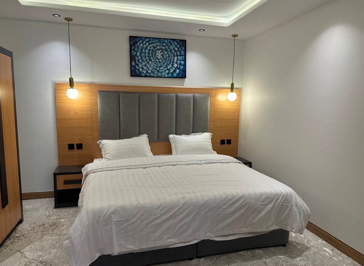 شقة فندقية راقية بتصميم عصري وأثاث فاخر، تجمع بين الراحة والفخامة لتمنح الضيوف تجربة إقامة مميزة. تتكوّن من غرفة نوم وصالة وبلكونة ومطبخ متكامل، وتوفر أجواء دافئة وخدمات تضاهي أفضل الشقق الفندقية.
