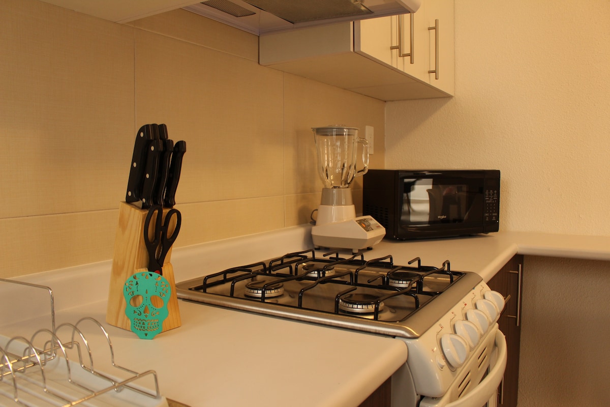 Preciosa suite de 2 recámaras, cocina de lujo perfectamente equipada, baño completo en recámara y medio baño para recámara abierta. Cuenta con balcón con vista a calle para fumar. Equipada con 2 pantallas planas de gran tamaño (55 y 65 in) con 80 canales de entretenimiento y conexión a plataformas de "streaming". Cuenta con caja de seguridad y se ofrece limpieza diaria, servicio de lavandería (gratuito en estancias de al menos 5 noches) y contamos con estacionamiento techado en la propiedad.
