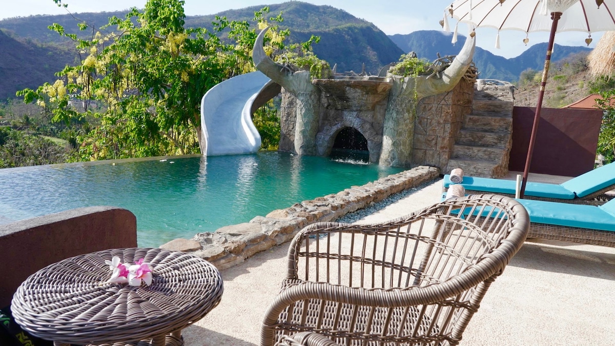 Katana Villa's "Dragon’s Nest" is the perfect place for a family or honeymoon couple to dream with spectacular OCEAN and Mountain VIEWS. This dragon nest has a top rated pool for children! By far one of the most unique vacation villas in Bali with a double level pool, waterslide, pool cave and a DRAGON'S NEST as the upper pool. This cottage has one king bed and comfy mattresses for an additional three.