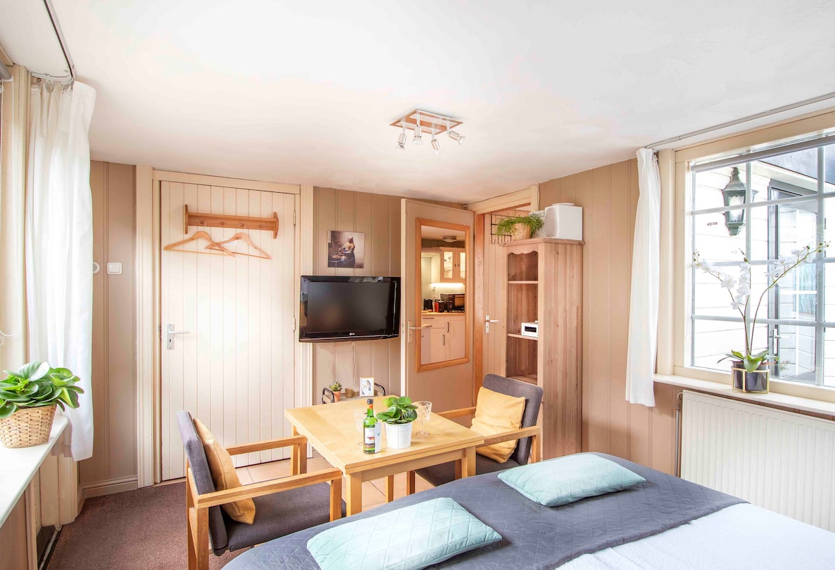 Este apartamento tipo estudio en el corazón de la ciudad ofrece una rara combinación de tranquilidad y comodidad central. Tendrás tu propia terraza jardín privada con sauna, junto con las comodidades del espacio de estudio bien pensado, ¡todo en una casa histórica que se siente como Ámsterdam! Hay excelentes vistas desde la azotea, una cama lujosa, cocina americana y espacios de descanso en el interior y en el exterior. Está a poca distancia de las principales atracciones de la ciudad y hay muchos restaurantes en la puerta.