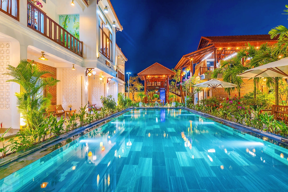 A Curator’s Note: Welcome to "The Tropical Hideaway," the third jewel in our bespoke "Cua Dai Heritage Collection." We operate only three highly exclusive, private villas in Hoi An. While this modern 3-bedroom retreat mirrors the premium layout of our sister property, it offers its own distinct, sunlit charm. Designed exclusively for intimate groups of 6 adults and 2 children, this is for those who value absolute privacy, a short stroll to the beach,