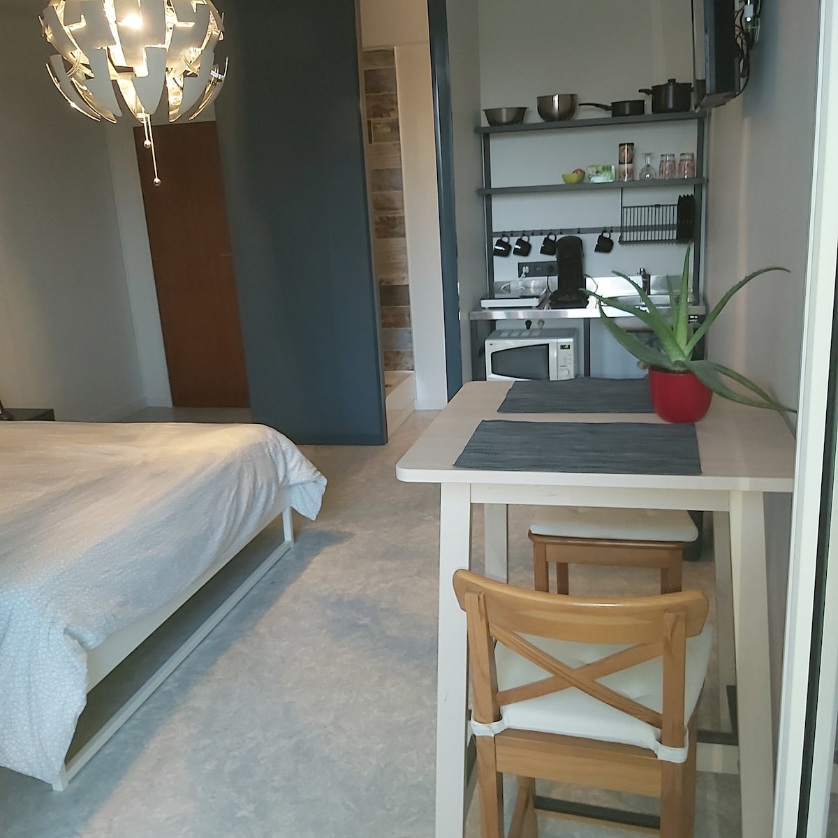 Gran estudio-loft, situado en la 3.ª planta (! sin ascensor !), amueblado con estilo y modernidad. Consta de: una cama doble, una sala de estar con TV, equipo de música y Airplay, una cocina equipada, un baño con ducha y aseo.