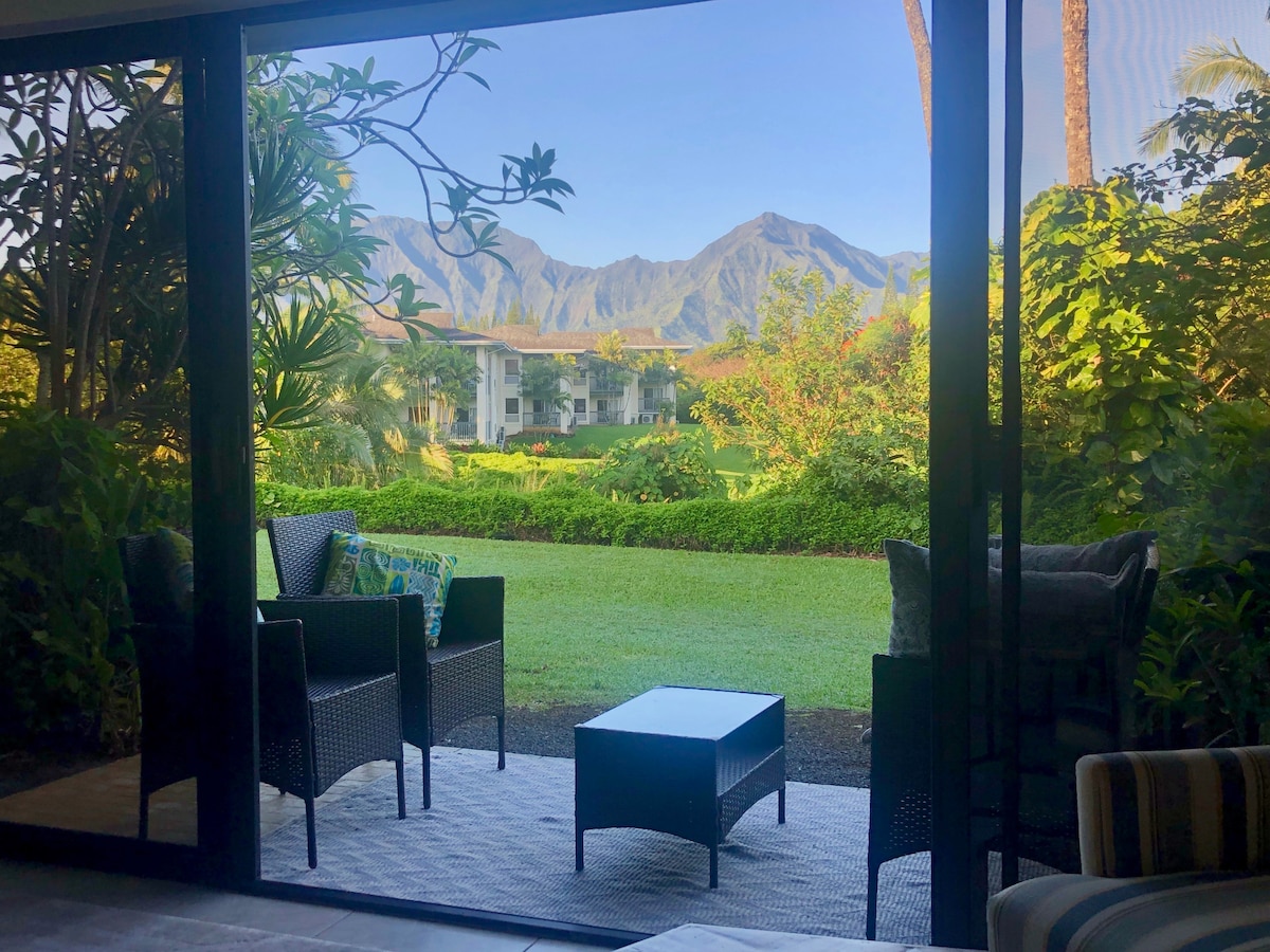 HBR #1106 Ocean, Mountains, Waterfalls, Sunsets and Rainbows! Incredible Hanalei Bay Resort - annually voted by visitors as the Best and Most Fun place on Kauai. A full view of Hanalei Bay in all of it's glory. This fully air conditioned ground floor condo is steps from parking - no stairs to struggle with - access out your sliding glass to the plush world of the Hanalei Bay Resort - steps away from the gorgeous pools and hot tub. This place has it all!
