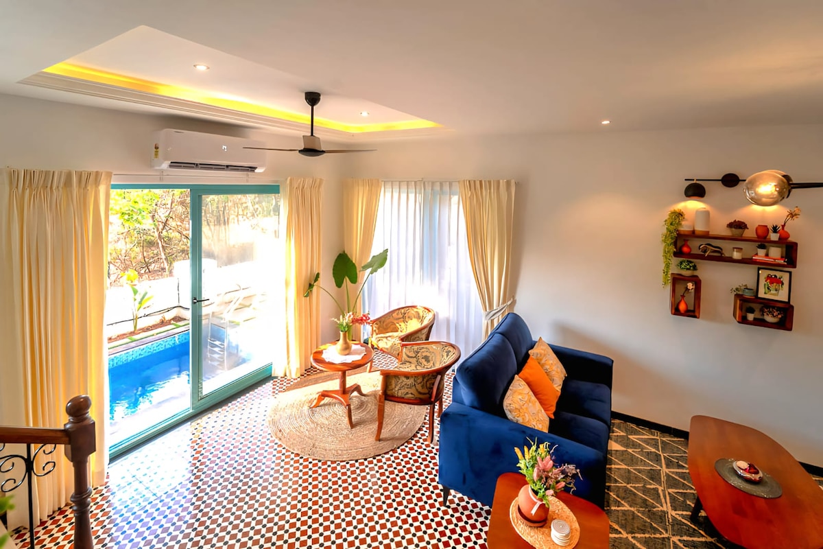 Welcome to Villa d’Summer — step into a slice of Greece / Santorini in the heart of Goa at this luxury villa with tasteful interiors & lush green gardens - by an interior designer. Perfect for groups, just 5 mins from the beach. ✮ Central location ✮ 5-10 Mins drive to the beach ✮ 2 Community Pools & Open Air Shower ✮ Additional Barbeque & Grill Available ✮ International Greek Vibe ✮ Most Green, Quiet & Peaceful Complex ✮ Three side 270° backyard with seating ✮ Superhost with 100% response rate