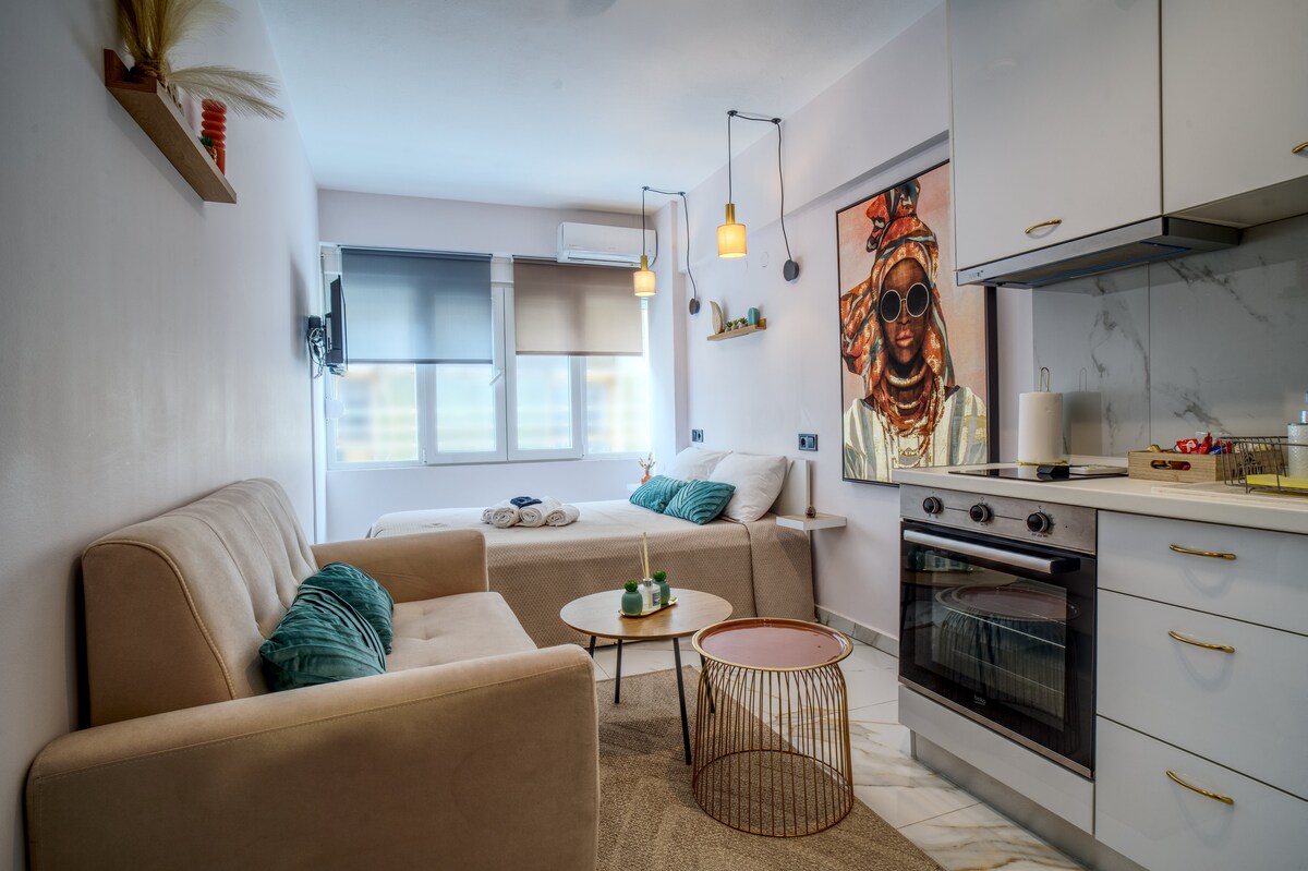 Welcome to your modern, fully renovated city retreat in Mpotsari, one of Thessaloniki’s most peaceful and pleasant neighborhoods. Just a 5-minute walk to the famous Promenade, located between two metro stations, and only 15 minutes from the airport, this bright 44 m² apartment offers the perfect balance of comfort and location. Whether you're visiting for a romantic getaway, a city break, a family trip, or a longer stay, this home is designed to make you feel at home from the very first minute.