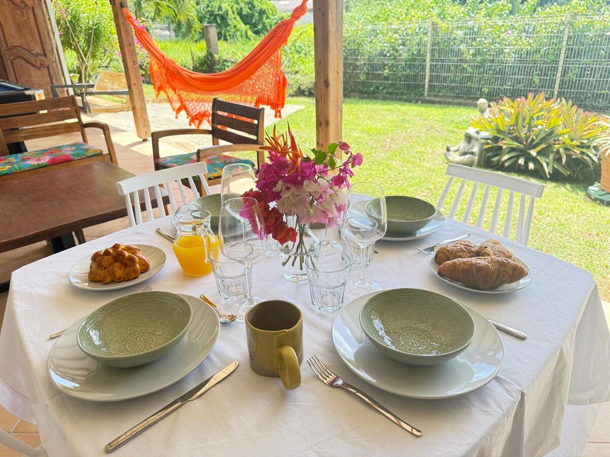 Alojamiento entero T2. Tranquilo y cómodo, instalado debajo de un callejón donde le espera su espacio de estacionamiento gratuito. En el corazón de la ensenada Mitan a 200 metros de la playa, cerca de la punta del final, con todas las comodidades necesarias, el pueblo criollo, el transporte público y marítimo.