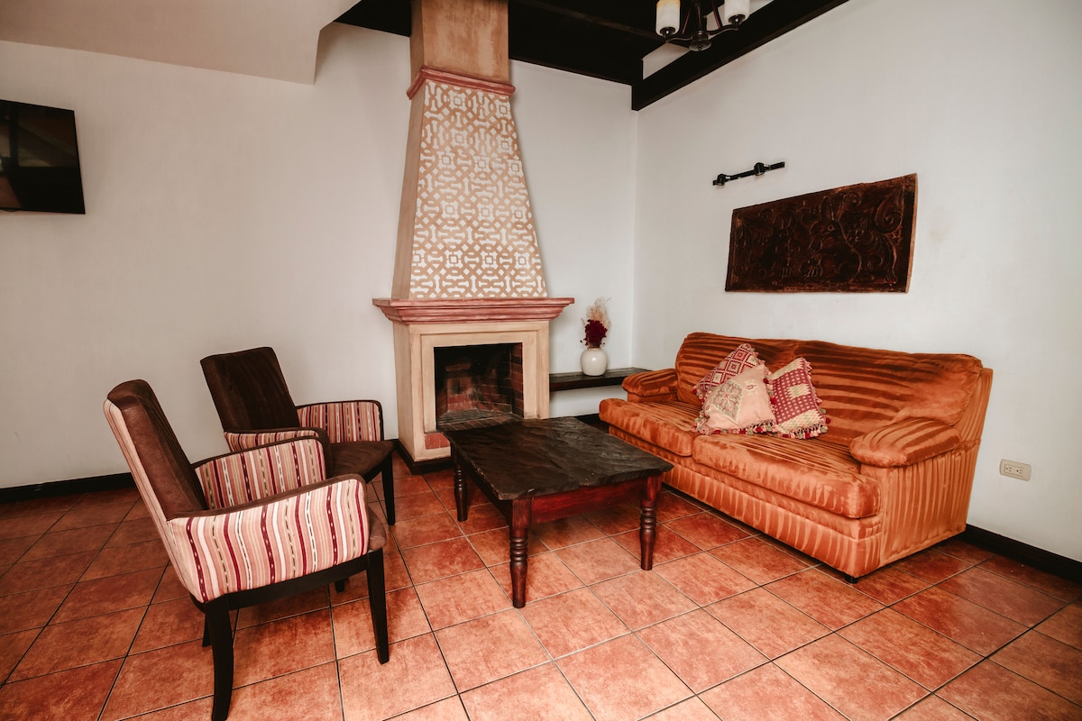 Apartamento de un dormitorio en el centro de La Antigua Guatemala. Sala con chimenea, comedor para 8 personas, cocina completamente equipada, un baño completo, patio con fuente, seguridad 24 horas y distancia 100% caminable al Parque Central de 5 cuadras y áreas comerciales. Tenemos Mini Bar, puedes pagar por medio de Airbnb o Cash.