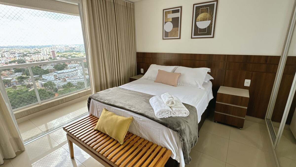 Alójate cómodamente en este moderno apartamento, perfecto para un máximo de 4 personas. La ubicación es inmejorable: cerca de Flamboyant Shopping, que tiene un increíble centro gastronómico y varias opciones de ocio. En la planta baja del edificio, hay cafeterías y restaurantes que aportan aún más comodidad a tu estancia. Piscina infinita en la planta superior y una hermosa vista de la ciudad Ubicación estratégica y una experiencia de estancia inolvidable en Goiânia. Ajuar de alta calidad.
