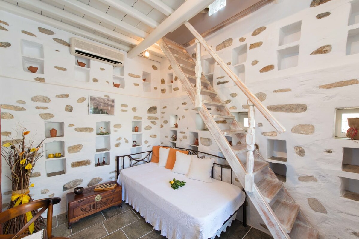 Bienvenido a relajarte en nuestra tradicional casa de campo de piedra, tranquila y elegante. Disfrutarás de unas vacaciones inolvidables en una casa de campo que ofrece vistas panorámicas, vistas al mar, árboles frutales, plantas y vides en un jardín de 1100 m2, a solo 7-8 minutos a pie del centro de la capital Apollonia. El restaurante más cercano está a unos 150 metros. La pareja de propietarios que viven en el mismo patio de 1100 m2, con amplia experiencia de viaje en todo el mundo, te ofrecerán la famosa hospitalidad tradicional griega.