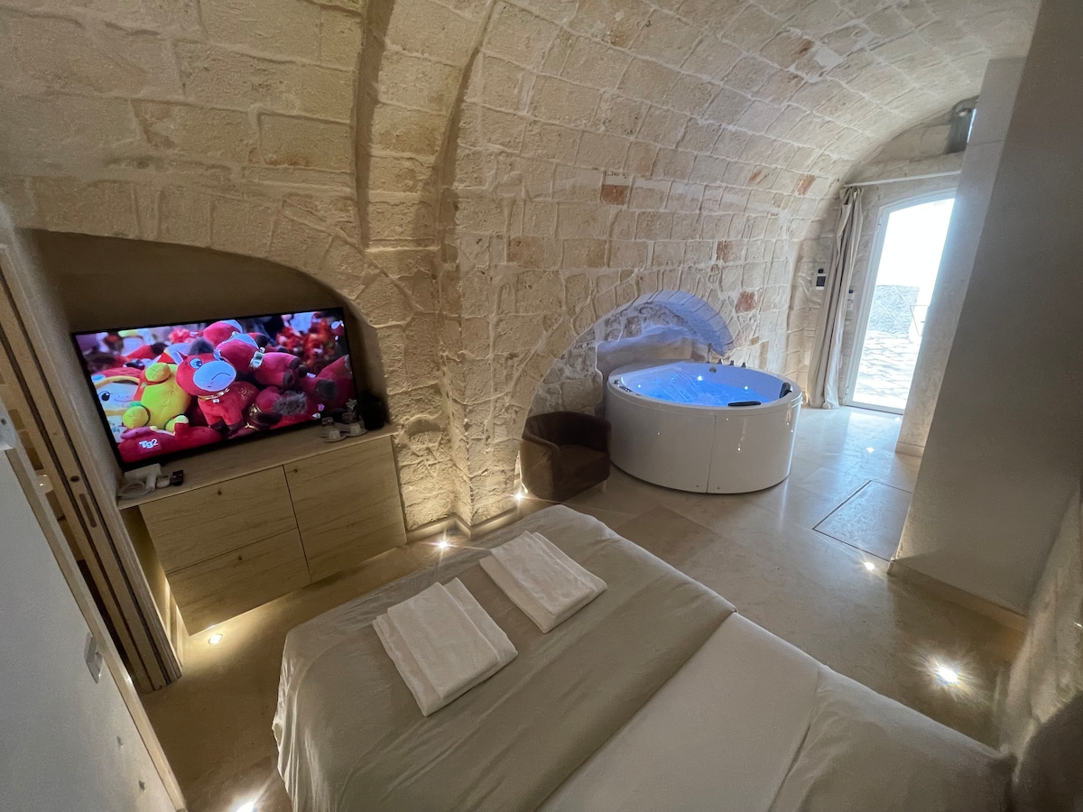La suite offre una camera matrimoniale con la possibilità di un letto aggiuntivo. Include un lamione con letto a castello, divani, TV, cucina, frigo e bagno. Il lamione è composto da un letto a castello con separè in ferro battuto e tendina, e una camera matrimoniale con doppie finestre che affacciano sulla corte e una volta in tufo a vista. È possibile aggiungere un letto. La sala relax è dotata di divanetti, TV, lettore DVD e impianto Home Theatre. L'angolo cottura comprende un frigo e un tav.